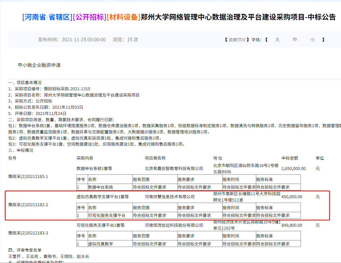 师慧软件凭借多年深耕校园GIS平台的经验和先进的可视化校园平台开发技术,以及严格的质量管控体系和完善的售后服务体系,在竞争性磋商中从多家投标单位中赢得评审专家肯定,并最终获得采购方郑州大学的认可,成功中标。